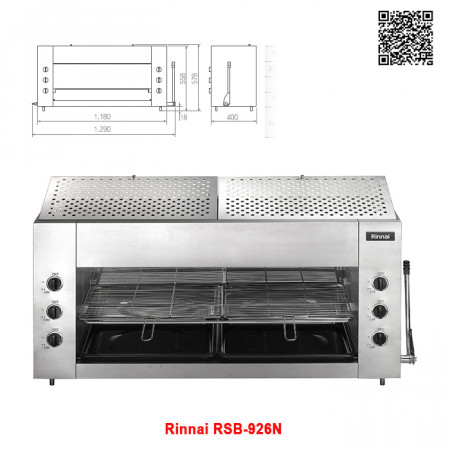 Lò nướng Salamander 6 họng Rinnai RSB-926N có thiết kế thông minh, hiện đại với kích thước lớn 1260 x 400 x 600 mm, phù hợp cho gian bếp có quy mô vừa và lớn.